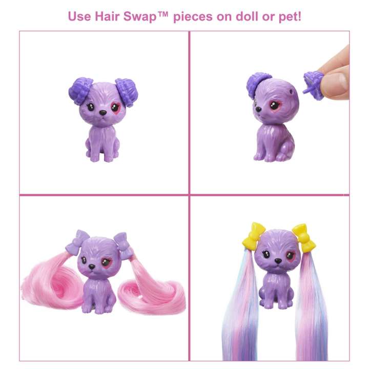 - Representa diferentes transformaciones de peinados con la muñeca Barbie® y su amiga mascota usando los postizos enchufables. Crea una apariencia y luego cámbiala. ¡Tantos peinados geniales para probar!