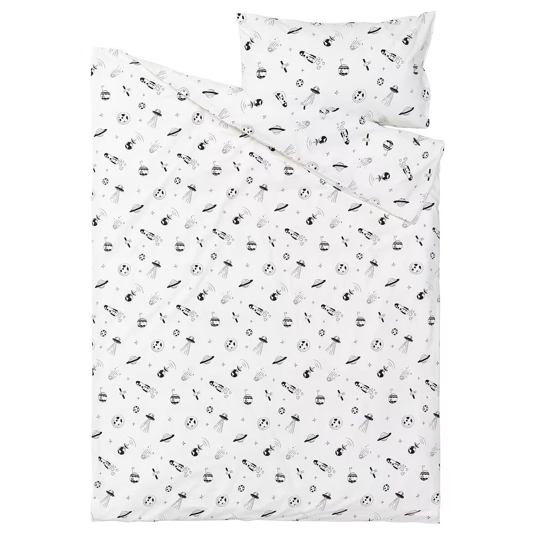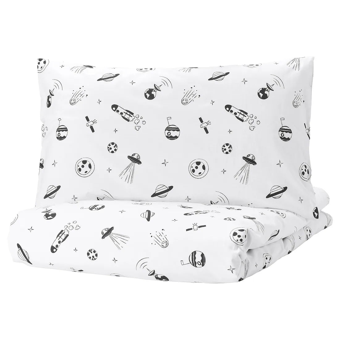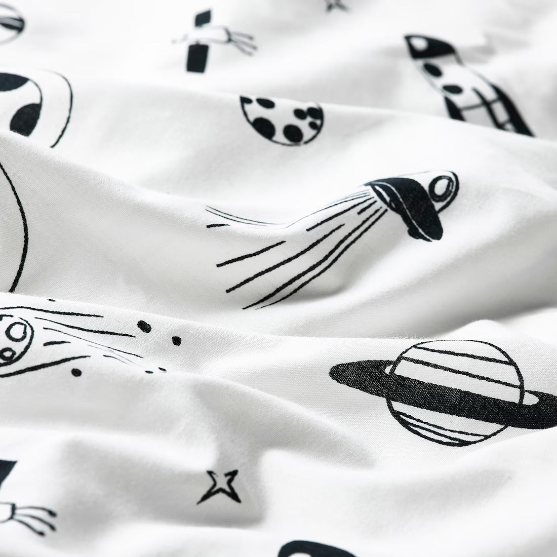 Sábana y funda estampados con muchos planetas, lunas y estrellas tiene una misión: hacer que la cama de un niño sea acogedora. Un sueño para los pequeños astronautas.