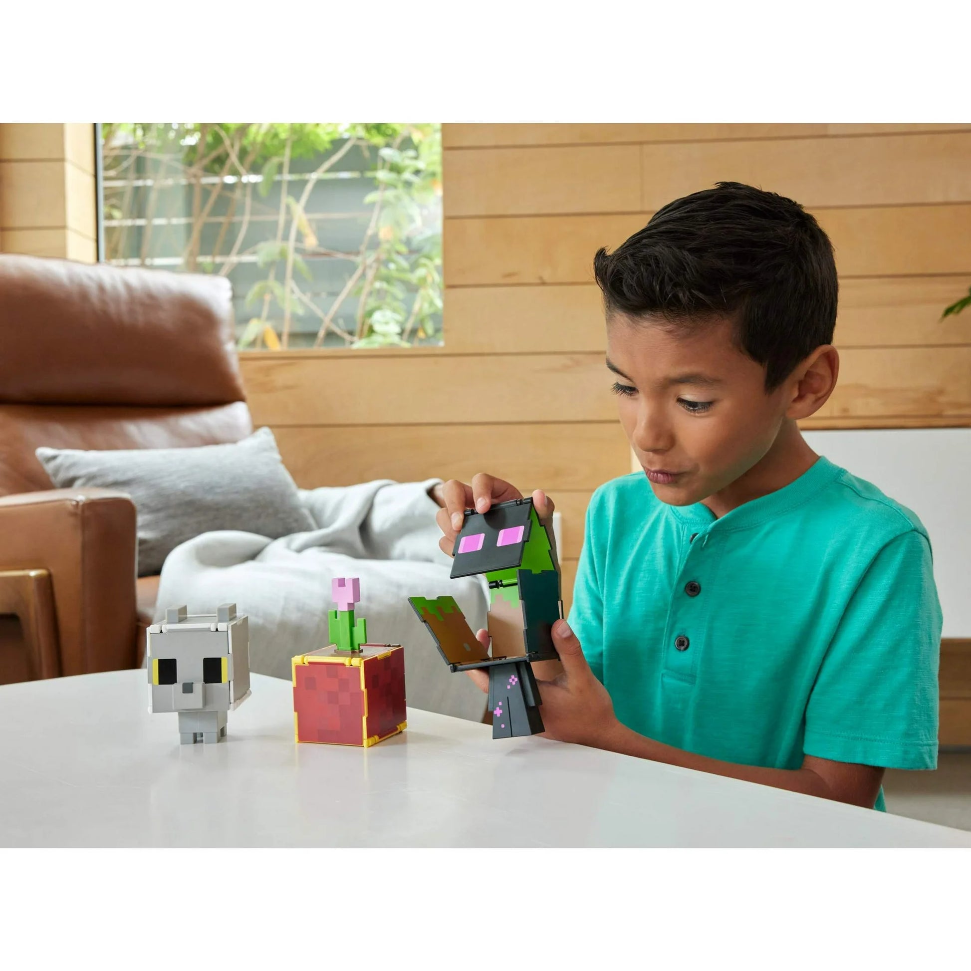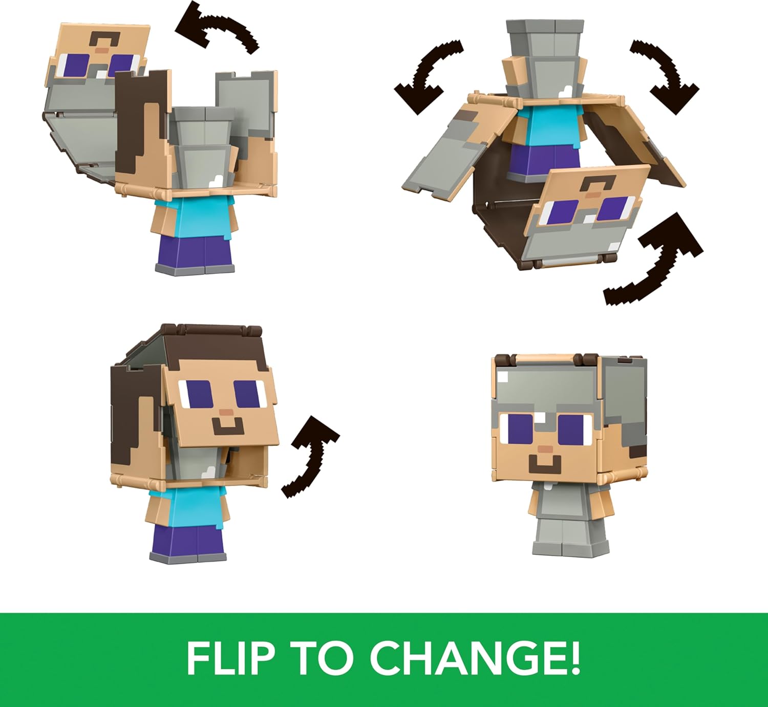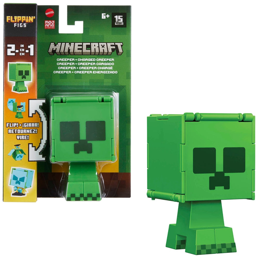 ¡Prepárate para la acción sin parar con las figuras coleccionables de Minecraft Flippin' Figs! Estos Flippin' Figs a escala de 9,5 cm se pueden voltear y transformar fácilmente de una figura a otra. ¡Simplemente levante los paneles en la cabeza de gran tamaño de cada figura y asegúrelos en su lugar para revelar una figura de Minecraft diferente en segundos para un juego 2 en 1 que debe repetirse una y otra vez!