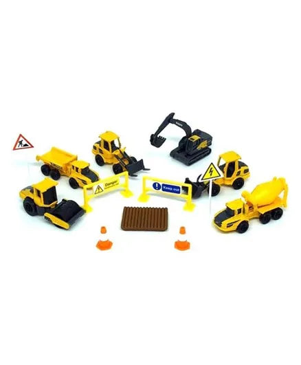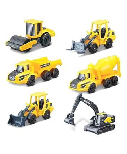 Los vehículos Die-Cast de Obra de Construcción Volvo están listos para el trabajo. Colores clásicos de Volvo amarillo y gris en envases de la marca.